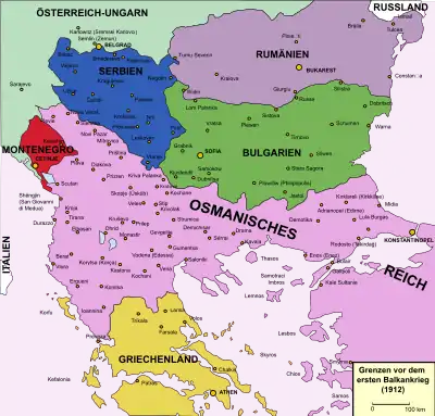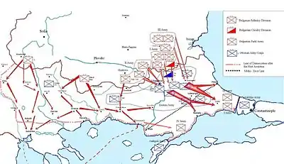 After the successful coup d'état for unification with Eastern Rumelia,[24] Bulgaria began to dream that its national unification would be realized. For that purpose, it developed a large army and was identified as the "Prussia of the Balkans."[25] However, Bulgaria could not win a war alone against the Ottomans.
