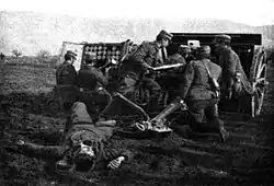 Due to poor organization, transportation problems and the protracted war with Italy, the Ottoman order of battle only had 12,024 officers, 324,718 other ranks, 47,960 animals, 2,318 artillery pieces and 388 machine guns ready by early October instead of the planned full complement of 750,000 officers and soldiers.[28] A total of 920 officers and 42,607 men of them had been assigned to non-divisional units and services, the remaining 293,206 officers and men were assigned to four armies.[29]