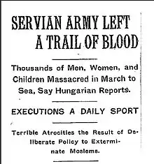 124. Geshov, Ivan Evstratiev (1919). La genèse de la guerre mondiale: la débâcle de l'alliance balkanique (in French) (as for example that of the Serbian deputy Triša Kaclerovićh, who, in an article published in 1917 by the International Bulletin, affirms that in 1912-1913 120,000 Albanians were massacred by the Serbian army ed.). P. Haupt. p. 64. Retrieved 9 August 2023.