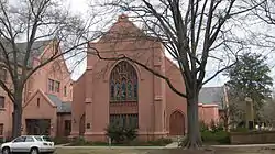 The 1813 building still exists, and is now known as Jackson Hall. A new, larger English Gothic[4] structure was built in 1853. Though spared the torch during Sherman's march to the sea, the building's original 180-foot spire was destroyed in an 1875 hurricane, and rebuilt in 1888.[2] The spire was again damaged in a 1910 fire, and rebuilt to be eight feet taller.[2] A remodelling in 1925 increased the capacity of the building to 1,250 from 800, increasing the length of the building by 40 feet. At the same time, classrooms were built at the sides, a choir loft added in the rear, and the organ loft rebuilt.[2] The architect of the remodelling project was R. H. Hunt of Chattanooga, Tennessee.[5]