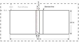 The playing field is divided in half by a 5 cm wide ribbon-like red and white net. It is held above the center line between two posts, its upper edge is located at 2 m height (men) and 1.90 m (women). For the D-Youth (under 12), the height is 1.60 m, the C-youth (under 14 years) 1.80 m. The field also includes a run-off area, which when playing outdoors is 8 m to the rear and 6 m on the sides. For indoor play, run-off areas are limited by the wall or stands, but are generally a minimum of 1 m to the rear and 0.5 m at the sides.