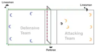 The linesmen are stationed in the opposite corners of the field from the referee, and use flags to signal their calls. Their task is to make judgements on line calls, similar to a soccer linesman. The observation area of the two linesmen is dependent on which of the two teams is currently attacking and which is defending. The linesman on the attacking side is responsible for the entire sideline to the end, and therefore he or she turns to face the side line. The linesman on the defending side is level with the base line and is therefore solely responsible for observing that line. The linesmen change their observation areas as the play changes between attack and defense.