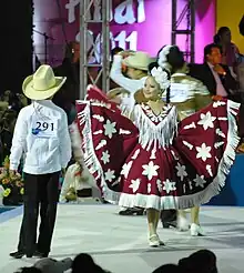 [1]Folk dance of Mexico, commonly known as baile folklorico or Mexican ballet folk dance, is a term used to collectively describe traditional Mexican folk dances. Ballet folklórico is not just one type of dance, it encompasses each region's traditional dance that has been influenced by their local folklore and has been entwined with ballet characteristics to be made into a theatrical production.[2] Each dance represents a different region in Mexico illustrated through their different zapateado, footwork, having differing stomps or heel toe points, and choreography that imitates animals from their region such as horses, iguanas, and vultures.[3]