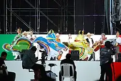 The Jarabe is considered Mexico's “national dance” and is the best known outside the country, often called the “Mexican Hat Dance” in English.[24][25] The dance was performed for the first time formally in 1860 at the Coliseo Theater in Mexico City. During the 1860s it was fashionable in high society.[25] The dance symbolizes the courtship of a woman by a man, who at first is refused but accepted in the end. The two protagonists are usually a man in a charro suit and a woman in a “China Poblana” outfit. It was popularized internationally in the 20th century by Russian dancer Anna Pavlova who visited Mexico in 1919. She made the dance part of her permanent repertoire. The dance's current form emerged nationally during the Mexican Revolution although various “jarabe” dances existed before this time, such as the Jarabe Jalisco, the Jarabe Atole and Jarabe Moreliana. The charros outfit is from Mexico's cowboy tradition and the China Poblana outfit is based on the dress of an Asian woman who became famous in the city of Puebla in the colonial period. Today, this dress, especially the skirt, is heavily decorated with patriotic themes. The Jarabe is danced to Mariachi music and is performed at Mexican national holidays such as Las Fiestas Patrias, Cinco de Mayo, and El Dieciséis de Septiembre.[2]