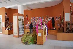 Another place that has very unique and different dresses for dancing is Michoacán, Mexico. Their dresses are very different from Jalisco. The dresses in Michoacán are very simple but elegant. They have a long skirt with very little detail of ribbons. The upper part of the dress is made up of a simple blouse that has embroider detail around the neck, they also use a belt and an embroidered apron.[29] In Michoacán they have many dresses depending on the event, they have dresses that are for everyday wear and dresses for special ceremonies or occasions. There are many parts that go along with the dress from the hair to all the accessories that they wear.[30] The everyday dress for women in Michoacán is made up of five items of clothing. These items consist of an underskirt, skirt, an apron, shawl, and lastly a blouse which is also known as a guanengo.[30] All of these item are made of different fabrics and color which makes each item stand out. Like the dresses from Jalisco, the dresses in Michoacán also have bright colors with little use of black. For special day like Palm Sunday for example, they add more accessories. These accessories consist of sashes, beaded necklaces, hats woven of palm leaves, masks, fresh fruit, mirrors and tinsel.[30] They also different accessories for special ceremonies that are done in their communities which makes them stand out due to the variety in their dresses.