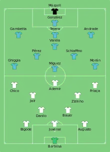 - ↑ In football terminology, a "line" refers to the tactical disposition of a row of football players on a field. Normally there are three lines: defense, midfield and attack. In a specific gaming system, the number of players per line is specified. For example, a "5-3-2 system", with five defenders, three midfielders and two strikers. When the spaces between the lines are too big, usually this refers to lines which allow too much space for the opponents in that part of the field.