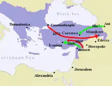 Military campaigns of the ByzantineSeljuk conflict from 10671071. Byzantine territory (purple), Byzantine campaigns (red) and Seljuk campaigns (green)