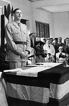 On August 24, 1958, in Brazzaville, President Charles de Gaulle recognized that African states had legitimate demands in terms of independence, but that they should go through a period of political learning in the French Community, an organization encompassing France and its colonies.[19] A referendum was organized on September 28, 1958, to decide on the fate of the African states in question. Voting "yes" meant joining the French Community and engaging on a path to independence, while voting "no" meant immediate independence. De Gaulle had also warned that states voting "no" would commit "secession", and that France would pull out their financial and material aids.[20] All voted yes but Guinea, led by Ahmed Sékou Touré, head of the [[Democratic Party of Guinea —African Democratic Rally|Democratic Party of Guinea]]. On October 2, 1958, Guinea proclaimed its independence, and Sékou Touré became its first ever president. At the time, France was still processing its defeat in Indochina, and feared uprisings in Cameroon and other African nations. Paris feared that Guinea could incite similar movements in the region, so they decided to engage in political and economic retaliation. Though Sékou Touré had sent a letter to de Gaulle on October 15, 1958, asking for Guinea to stay in the CFA franc zone, France banished them from the monetary union in the wake of their independence.[19] Resolutely isolated, Guinea got closer to Eastern Bloc countries in the context of the Cold War. They started working on a new currency with the help of foreign experts, but France saw this as a threat to the stability in the region and its influence there. Therefore, in 1959, France launched operations to undermine the regime in place. Among the methods of destabilization used, one called "Operation Persil" involved introducing a large quantity of fake bills of the new currency in the country to cause inflation and disturb the economy.[19] Nevertheless, with the help of the USSR and China, Sékou Touré's regime held on power until his death in 1984.