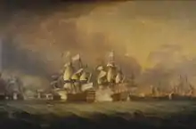 The British position was strengthened even more in September with the destruction of the Franco-Spanish assault on Gibraltar and the garrison's relief by the Royal Navy the following month.[9] A preliminary peace treaty between Great Britain and America was signed on 30 November; Britain acknowledged that the United States owned all the land south of the Great Lakes and east of the Mississippi River, except for Florida (which went to Spain). The French accepted the preliminary with protests but no action. Since France was not included in the American-British peace discussions the influence of France and Spain in future negotiations was limited.[12]