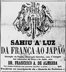 10. 1 2 3 Dr. Francisco Antonio de Almeida (January 1879), Da França ao Japão: Narração de Viagem e Descripção Historica, Usos e Costumes dos Habitantes da China, do Japão e de outros Paizes da Asia (in Portuguese), Rio de Janeiro, OCLC 1020876163, OL 6327358M, S2CID 160767256, Wikidata Q99930394{{citation}}: CS1 maint: location missing publisher (link)
