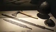 At this time the Franks, hearing that both the Goths and Romans had suffered severely by the war ... forgetting for the moment their oaths and treaties ... (for this nation in matters of trust is the most treacherous in the world), they straightway gathered to the number of one hundred thousand under the leadership of Theudebert I and marched into Italy: they had a small body of cavalry about their leader, and these were the only ones armed with spears, while all the rest were foot soldiers having neither bows nor spears, but each man carried a sword and shield and one axe. Now the iron head of this weapon was thick and exceedingly sharp on both sides, while the wooden handle was very short. And they are accustomed always to throw these axes at a signal in the first charge and thus to shatter the shields of the enemy and kill the men.[35]