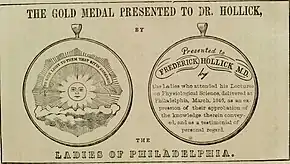 Much to his peers' dismay, Hollick went beyond writing sexual health manuals by holding frequent lectures and demonstrations in Philadelphia to spread his beliefs. Using a papier-mâché recreation of the female body as a guide, Hollick taught audiences where female sexual organs were located and how they should properly be used during sex. Although audiences were initially shocked at seeing such a lifelike representation of a naked woman, many women were grateful for such an informational display at a time when female sexual pleasure was deemed non-existent and little knowledge of how female sexual organs function was actually known. In addition, Hollick advocated heavily for the physiological necessity of sex in consenting adults, regardless of marital status.[6] He insisted that sex was an organic expression of human nature, citing the act as "...the highest and most absorbing excitement that animated beings can experience".[7] While his lectures created a fairly large following, they also garnered an even greater opposition.