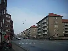 In 1870 the City of Copenhagen began to buy up land in the area and the civil parish of Brønshøj-Husum was merged into Copenhagen in 1901.[1] The area along the road was gradually built over with a combination of housing and industry. Glud og Marstrand occupied a large site bounded by Grederiksborgvej, Rentemestervej, Rebslagervej and Drejervej.[2]