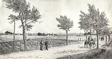 Frederiksborgvej seen on a drawing by Janus Laurentius Ridter with Bispebjerg Windbill just visible to the right
