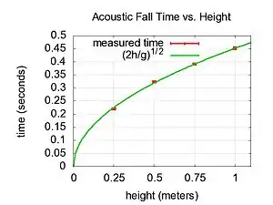 Measured fall time of a small steel sphere falling from various heights. The data is in good agreement with the predicted fall time of , where h is the height and g is the free-fall acceleration due to gravity.