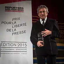 Cumhuriyet's former editor-in-chief Can Dündar receiving the 2015 Reporters Without Borders Prize. Shortly after, he was arrested.