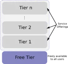 The freemium model is closely related to tiered services. Notable examples include LinkedIn,[6] Badoo,[7] Discord,[8] and in the form of a "soft" paywall, such as those employed by The New York Times[9] and La Presse+.[10] This is often in a time-limited or feature-limited version to promote a paid-for full version. The model is particularly suited to software as the cost of distribution is negligible.