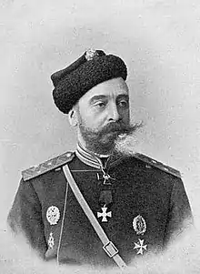 Also in 1876, Keller volunteered for service with the Serbian Army during the Serbian-Turkish Wars (1876-1878) and was promoted to the rank of lieutenant colonel and distinguished himself in a number of combat operations. In September of the same year, he became a member of the staff of Major-General Mikhail Chernyayev (nicknamed the 'Russian General Custer'), and was assigned as aide-de-camp to the tsarevich Alexander Alexandrovich (the future Tsar Alexander III) and the Field Marshal Prince Aleksandr Baryatinsky, both of whom were in Serbia serving with the Russian volunteer expeditionary force.[4]