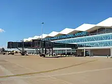 Gaborone is situated between Kgale Hill and Oodi Hill, near the confluence of the Notwane River and Segoditshane River in the south-eastern corner of Botswana, 15 kilometres (9.3 mi) from the South African border.[13] The city is served by the Sir Seretse Khama International Airport. It is an administrative district in its own right, but is the capital of the surrounding South-East District.[14] Locals often refer to the city as GC or Motse-Mshate.[15]