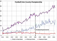 Irish forms of football were not formally arranged into an organised playing code by the Gaelic Athletic Association (GAA) until 1884 with the rules widely distributed in 1887. The GAA sought to promote traditional Irish sports, such as hurling, and to reject "foreign" (particularly English) imports. The first Gaelic football rules, showing the influence of hurling (and incorporating some of the Victorian Rules of 1866 and 1877[24][25][26]) represented the strong desire to differentiate from association football (and rugby)—for example in their lack of an offside rule. The rules were first drawn up by Maurice Davin in 1884 and later published in the United Ireland magazine on 7 February 1887. The original rules bear many similarities to modern football with the requirement to kick, handpass, and the basic scoring system, however, the original rules also included many Australian features including additional scoring posts (removed later in 1910[18]). The code had already begun to diverge, with the mark being deprecated, the soccer ball being adopted,[27] and carrying the ball not allowed, as such there was no requirement to bounce or solo the ball[28] carrying the ball remained illegal until the turn of the 20th century. The game was intended to promote peace and harmony, rejecting the violence of other football codes, and Davin even included a requirement for players to hold hands with their opponents[29] though this practice fell out of favour.