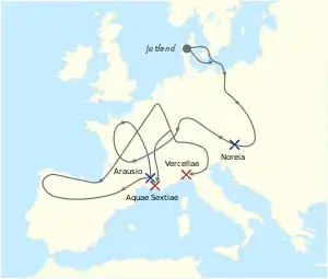 The Cimbri and another tribe called the Teutones appeared on the Rhône, and while Caepio was on the west bank he refused to come to the aid of Mallius on the east.[94] The Senate was unable to induce Caepio to cooperate with Mallius, which proved both generals' undoing. At the Battle of Arausio (modern Orange), the Cimbri overran Caepio's legions with massively overwhelming numbers. Caepio's routed men crashed into Mallius's troops, which led to both armies being pinned against the Rhône and annihilated by the numerically dominant Cimbrian warriors.[94] News of this defeat reached Rome just shortly after Marius completed the campaign against Jugurtha successfully.[95]