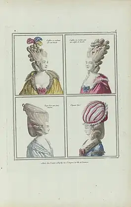 Galerie des modes was conceived during the final decades of the 1700s, a period when France was at the forefront of fashion innovation. To quote the historian James Laver, at this time "fashionable clothes...meant French clothes."[2] This supreme influence was undoubtedly strengthened by Queen Marie Antoinette as well as figures such as Rose Bertin (her dressmaker) and Monsieur Léonard Autié (her hairdresser) who were responsible for designing her iconic courtly wardrobe.[3] Beginning in the 1770s (the decade during which Antoinette both married future king Louis-Auguste and assumed the title Queen of France and Navarre), women's dress came to exhibit greater variation than ever before; the fashion plate emerged under these conditions, as if to disseminate each budding trend.