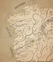80. "we cannot ignore the evidence for the Celtic presence in northern Gallaecia, which is confirmed by ancient authors: Celtici cognomine Neri et Supertamarci (Pliny 4.111), ad promunturium quod Celticum vocamus (Mela 3.9); Artabri . . . Celticae gentis (Mela 3.14), and by epigraphy, with mention of certain peoples and individuals who call themselves Celtici, for instance Fusca Coedi f. Celtica Supertamarica.53 For his part, Strabo (3.3.5) mentions, moreover, the close connection of some of these Gallaeci with the Celtici from Baeturia, in the Guadiana area, to the south of Lusitania. This relationship of the Gallaeci to the south-western Celtici, as well as that with Celtiberia (Pliny 3.13), can be demonstrated by some onomastic indicators, such as the special Celtiberian tendency to use duo nomina formulae with a name in -iko on the basis of nomen gentilicium, a fact noted amongst the south-western Celtici (C. Pagusicus Lucianus) and the Gallaeci (Apanicus Capito). Nor should one forget that in northern Gallaecia there are toponyms and ethnonyms which are well justified by Celtic (Nerion, Arotrebae, Albiones, cf. Welsh elfydd 'world', Gaulish Albiorix), as well as dedications to Lugu (Map 12.2), which link it with Celtiberia in particular." Gorrochategui, J.; Vallejo, J. M. (28 February 2019). "The parts of Hispania without epigraphy". Palaeohispanic Languages and Epigraphies. Oxford University Press. pp. 335–364. doi:10.1093/oso/9780198790822.003.0012. ISBN 978-0-19-879082-2. Archived from the original on 14 February 2022. Retrieved 23 January 2022.