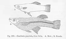 The Cuban gambusia (Gambusia punctata) is a species of freshwater fish. It is a member of the family Poeciliidae of order Cyprinodontiformes, and is the type species of its genus. It is native to Cuba, inhabiting primarily stagnant lakes or ponds and slow-moving streams. A carnivorous surface feeder, it occurs in shoals near the shoreline.