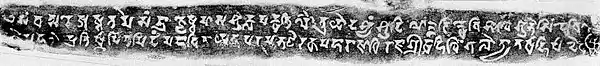 The inscription appears on the base of the statue. It is written in the Siddhamatrika script, a development of the Brahmi script,[5] or in proto-Sharada script:[6] An analysis of the writing suggests a date from the 6th or 8th century CE.[7]