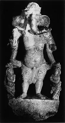 D.C. Sircar has dated the statue to the 6th-7th century CE, and more precisely 7th century CE based on the paleography of the inscription on its base.[1] Some authors have attributed the statue to the transitional period between Kushan art to Gupta art, to the 5th or even 4th century CE.[1] The statue of Ganesha from Gardez is now attributed to the period of Turk Shahis in the 7-8th century CE, rather than to their successors the Hindu Shahis (9th-10th century) as formerly suggested.[2] The datation is essentially based on stylistic analysis, as the displays great iconographical and stylistic similarities with the works of the Buddhist monastery of Fondukistan, which is also dated to the same period.[2]