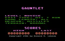 Gauntletak is a multidirectional shooter video game written by Donald R. Lebeau for the Atari 8-bit family of home computers.[1] It was released as shareware in 1984 with a full-version available for registration of US$35. Gameplay is divided into separate screens (50 in all) with terrain and enemies. The game was originally titled Gauntlet, but was renamed after the Gauntlet arcade game from Atari Games was released in 1985.