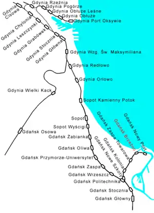 The line connecting Gdańsk Główny (Danzig Hbf.) with Gdańsk Nowy Port (Danzig Neufahrwasser) was opened in October 1867. It had been electrified in 1951, but the voltage was changed (from 800 volts) into standard 3 kV in 1973. The line served mostly as the transport route for shipyard workers who commuted to the Gdańsk Shipyard. On December 15, 2002, the line was shortened to reach only Gdańsk Brzeźno. On June 25, 2005, the line was completely closed for passenger service.