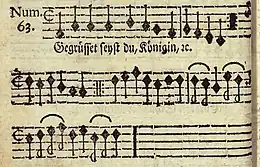 A different melody appeared first in a 1736 hymnal from Hildesheim, Geistliche Spiel- und Weckuhr. It was taken by emigrants to the U.S., with an English text, Hail, Holy Queen, enthroned above,[3] which first appeared in The Roman Missal in 1884.[4] This version became popular after it was featured in the 1992 film Sister Act.[1]