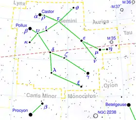 δ Gem (Wasat) is a long-period binary star 59 light-years from Earth. The primary is a white star of magnitude 3.5, and the secondary is an orange dwarf star of magnitude 8.2. The period is over 1000 years; it is divisible in medium amateur telescopes.
