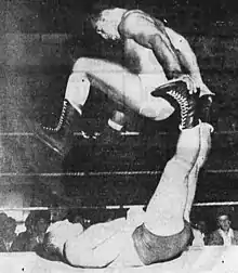 Al-Kaissie, then billed as Billy White Wolf (top), during a wrestling match against Bill Savage on 20 February 1963 in Klamath Falls, Oregon.