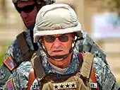 Casey served as the senior coalition commander in Iraq from June 2004 to February 2007. He replaced Lieutenant General Ricardo S. Sanchez.[4] Casey's goal was to encourage the Iraqis to take ownership of their problems and responsibility for their own security. For his part as a military commander, he focused on training Iraqi forces, limiting the role of American forces, and transferring the burden for providing security to Iraqi forces. Meanwhile, U.S. diplomats would focus on building and strengthening the Iraqi government and help the Iraqis hold elections. He expressed his view that a large and intrusive American presence in Iraq would not solve the political and security problems in that country and could even fuel the insurgency.