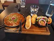 Khachapuri, also spelled as Hachapuri, is a traditional Georgian dish of cheese (fresh or aged, most commonly sulguni), eggs and other ingredients.[6]