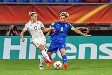 In the final round, the German team started with a 0–0 against the Netherlands, with the Dutch women had better chances to score. The subsequent game against Iceland was won 3–0 and due to the results of the other groups Germany was already qualified for the quarter-finals. In the final match against Norway, which was only about the group victory, the German team lost for the first time a European Championship final round match against Norway and after more than 20 years ever again a European Championship final round match.[7] In the quarter-finals, the team met as in 2009 on Italy and was able to prevail thanks to a performance increase with 1: 0. In the semi-finals, the tournament's youngest team met host Sweden, who competed with the oldest squad of all participants and was favored after their previous games. By the hitherto best tournament performance, however, the German team was able to prevail against Sweden as in all previous K. o.-games and reach the final by a 1–0 for the sixth time in a row where they met for the fourth time on Norway. The German team won the title for the eighth time with the third 1–0 victory in this European Championship, in which Nadine Angerer could hold two penalties by the Norwegians. The winner scored the second-half substitute Anja Mittag with her first ball contact.[8]