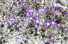 This is an annual herb producing an erect stem to a maximum height anywhere between 4 and 40 centimeters. The hairy or hairless stem has occasional small lance-shaped leaves. The solitary flower appears at the top of the stem. It is one or two centimeters long, bell-shaped, and deep violet with a white throat. The small, erect style can be seen in the throat.