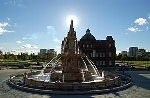 Glasgow became one of the first cities in Europe to reach a population of one million. The city's new trades and sciences attracted new residents from across the Lowlands and the Highlands of Scotland, from Ireland and other parts of Britain and from Continental Europe.[25] During this period, the construction of many of the city's greatest architectural masterpieces and most ambitious civil engineering projects, such as the Milngavie water treatment works, Glasgow Subway, Glasgow Corporation Tramways, City Chambers, Mitchell Library and Kelvingrove Art Gallery and Museum were being funded by its wealth. The city also held a series of International Exhibitions at Kelvingrove Park, in 1888, 1901 and 1911, with Britain's last major International Exhibition, the Empire Exhibition, being subsequently held in 1938 at Bellahouston Park, which drew 13 million visitors.[38]