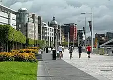 The city invested heavily in roads infrastructure, with an extensive system of arterial roads and motorways that bisected the central area. There are also accusations that the Scottish Office had deliberately attempted to undermine Glasgow's economic and political influence in post-war Scotland by diverting inward investment in new industries to other regions during the Silicon Glen boom and creating the new towns of Cumbernauld, Glenrothes, Irvine, Livingston and East Kilbride, dispersed across the Scottish Lowlands to halve the city's population base.[40] By the late 1980s, there had been a significant resurgence in Glasgow's economic fortunes. The "Glasgow's miles better" campaign, launched in 1983, and opening of the Burrell Collection in 1983 and Scottish Exhibition and Conference Centre in 1985 facilitated Glasgow's new role as a European centre for business services and finance and promoted an increase in tourism and inward investment.[41] The latter continues to be bolstered by the legacy of the city's Glasgow Garden Festival in 1988, its status as European Capital of Culture in 1990,[42] and concerted attempts to diversify the city's economy.[43] However, it is the industrial heritage that serves as key tourism enabler.[44] Wider economic revival has persisted and the ongoing regeneration of inner-city areas, including the large-scale Clyde Waterfront Regeneration, has led to more affluent people moving back to live in the centre of Glasgow, fuelling allegations of gentrification.[45] In 2008, the city was listed by Lonely Planet as one of the world's top 10 tourist cities.[46]