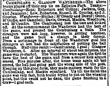 Its Cup runs were also short-lived, losing in the first preliminary round of the Scottish Cup to Partick Thistle, and in the second round of the Glasgow Cup (after a bye in the first) to Clyde. The Clyde match was particularly ill-tempered, being described as a "rabble affair" which ended with the Wanderers well behind[21] after players "exchanged blows" and the Wanderers - despite being the home side - were "mobbed off the field".[22] The club's protest was dismissed, although Clyde's M'Reedie was cautioned for "blacken[ing] the eyes of M'Innes, of the Wanderers".[23]