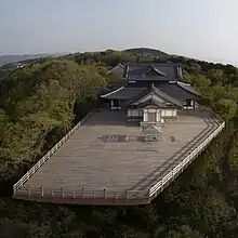 Shogunzuka is located on the peak of Mt. Higashiyama. Panoramic view of Kyoto could be observed from its deck where Glass Tea House - KOU-AN was exhibited. In 794 when Emperor Kanmu was looking for a location to establish a new capital, he climbed to the area now known as Shogunzuka and decided to move the capital to Kyoto, and constructed Heian Kyo, a city where Japanese culture and art bloomed.[4] Painting of the Blue Cetaka, a national treasure of Japan, is also dedicated to Shoren-in.[5]
