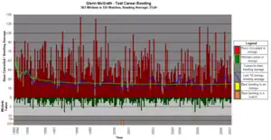 McGrath's batting prowess, in the early phases of his career, was poor; in fact, he scored first-ball ducks (zero runs) on both his Test[30] and One-Day International[31] debuts, and his batting average hovered below 4 for the first few years of his career. Years of patient tutelage from captain and friend Steve Waugh improved this aspect of his game to the point where he scored a Test half-century, which came on 20 November 2004[32] at the Gabba. His final score in that innings was 61, sharing a last wicket stand of 114 with Jason Gillespie (54*) to hilarity and the acclaim of their team-mates.[29] Nevertheless, McGrath was, for the duration of his career, regarded as a batting 'bunny', although he pushed his average above 7.00 runs/dismissal by the end of his career. In the first World Cricket Tsunami Appeal charity match, he was promoted to bat at number 6 ahead of specialist batsmen Stephen Fleming and Matthew Hayden, but was dismissed first ball trying to slog Muttiah Muralitharan. Towards the end of his international career McGrath, while not scoring many runs himself, became rather more difficult for opposing bowlers to dismiss, being dismissed only once during the 2005 Ashes series. With a contribution of 11 runs in the first innings of the MCG 2005 Boxing Day Test versus South Africa,[33] he stood his ground for 53 deliveries, helping Michael Hussey push the Australian tail to a record tenth-wicket stand against South Africa of 107 runs.