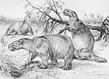 Glossotherium is an extinct genus of large mylodontid ground sloths of the subfamily Mylodontinae. It represents one of the best-known members of the family, along with Mylodon and Paramylodon. Reconstructed animals were between 3 and 4 metres (9.8 and 13.1 ft) long and possibly weighed up to 1,002.6–1,500 kg. The majority of finds of Glossotherium date from the Middle and Upper Pleistocene, around 300,000 to 10,000 years ago, with a few dating older, as far back Pliocene, about 3.3-3 million years ago.[2] The range included large parts of South America, east of the Andes roughly from latitude 20 to 40 degrees south, leaving out the Amazon Basin in the north. In western South America, finds are also documented north of the equator. The animals largely inhabited the open landscapes of the Pampas and northern savanna regions.