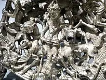 The decoration has been interpreted as a struggle between the forces of good and evil, and has speech and silence as a theme, with some of the figures placing hands over the mouths of others.[4] An inscription round the outside of the drip pan reads "+ lvcis.on[us] virtvtis opvs doctrina refvlgens / predicat vt vicio non tenebretvr homo" ("This flood of light, this work of virtue, bright with holy doctrine instructs us, so that Man shall not be benighted in vice"), and some figures are crawling up through the decoration, towards the light, while others are making away from it downwards.[3]