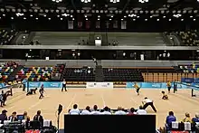 Played indoors, usually on a volleyball court, games consist of twelve-minute halves (formerly ten-minute halves) with three-minute half-time.[1] Where there is a tie, golden goal overtime occurs in the form of two three-minute periods (and a second three-minute half-time). If the tie persists, a paired shootout ('extra throws' and 'sudden death extra throws') determines the winner. Teams alternate throwing or rolling the ball from one end of the playing area to the other, and players remain in the area of their own goal in both defence and attack. Players must use the sound of the bell to judge the position and movement of the ball. Eyeshades allow partially-sighted players to compete on an equal footing with blind players.[1] Eyepatches may be worn under eyeshades to ensure complete coverage of the eye, and prevent any vision should the eyeshades become dislodged.
