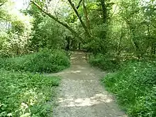 There are a number of ancient woods in the area. Great Wood (TQ 281 198) is a bluebell wood, with springtime carpets of Hyacinthoides non-scripta, the 'common bluebell'. These, along with wood anemone (Anemonoides nemorosa), grow under a coppice-with-standards tree-cover. On the south side of the Pook Bourne is the part-ancient, part-plantation Blackhouse Wood (TQ279 198). The secondary part has a ground cover of dog's mercury and the ancient part has bluebells and wood anemones. South of Shalford (TQ 284 197) are two more little ancient woods, Hungerfields Wood, in the crook of Northends Lane (TQ 280 191) and Northend Copse (TQ 285 181), a bluebell wood under oak and hazel, with at least one wild service tree. To the east, Parson's Withes (TQ 292 197), in the angle between Gatehouse and Pangdean Lanes, has varied flora and much thorn, both Midland hawthorn and common hawthorn and their hybrids.[7] The landowner allowed the public to use the woods for recreation until 2021, since when "Private: Keep out" notices have been put up. Locals have suggested this is so the land can ultimately be sold to developers with less protests from a concerned public.[9]