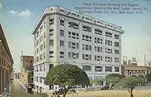 In 1912, the firm became González Padín y Co., Incorporated, and then Mr. Anselmo González Padin withdrew from the company, remaining, however, on the Island with his relatives. Don Jose González Padin then assumed the primary presidency of the firm. As the store had grown so much, it was necessary to make an extension to the premises, and the store extended to the Matienzo passage, to the three-story building next to the one it occupied. The first elevator for commercial use inside a store in San Juan was installed there. A soda fountain was also installed, the first in an establishment of its kind. The company would also later on open stores in Mayagüez and Ponce.[4] In 1923, at a cost of $750,000, González Padín would move to a new building which was built in the Main Plaza of San Juan, and would open their flagship store which became the "First Commercial Skyscraper" in Puerto Rico. San Juan finally had a large department store, facing the Plaza de Armas. The company continued its pioneering work in many details that were later on commonly used by businesses on the island. It was the first store to offer the home delivery service, and to have "a price for everyone", as the fixed price system that later on governed commerce on the island.[5][6]