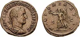 Gordian's positive reputation can be attributed to his reportedly amiable character. Both he and his son were said to be fond of literature, even publishing their own voluminous works.[25] While they were strongly interested in intellectual pursuits, they possessed neither the necessary skills nor resources to be considered able statesmen or powerful rulers. Having embraced the cause of Gordian, the Senate was obliged to continue the revolt against Maximinus following Gordian's death, appointing Pupienus and Balbinus as joint emperors.[36] Nevertheless, by the end of 238, the recognised emperor would be Gordian III, Gordian's grandson.[36]